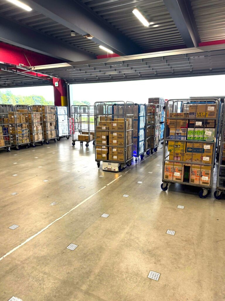 AGVs automatically bring pallets to temporary staging zones based on loading priority.